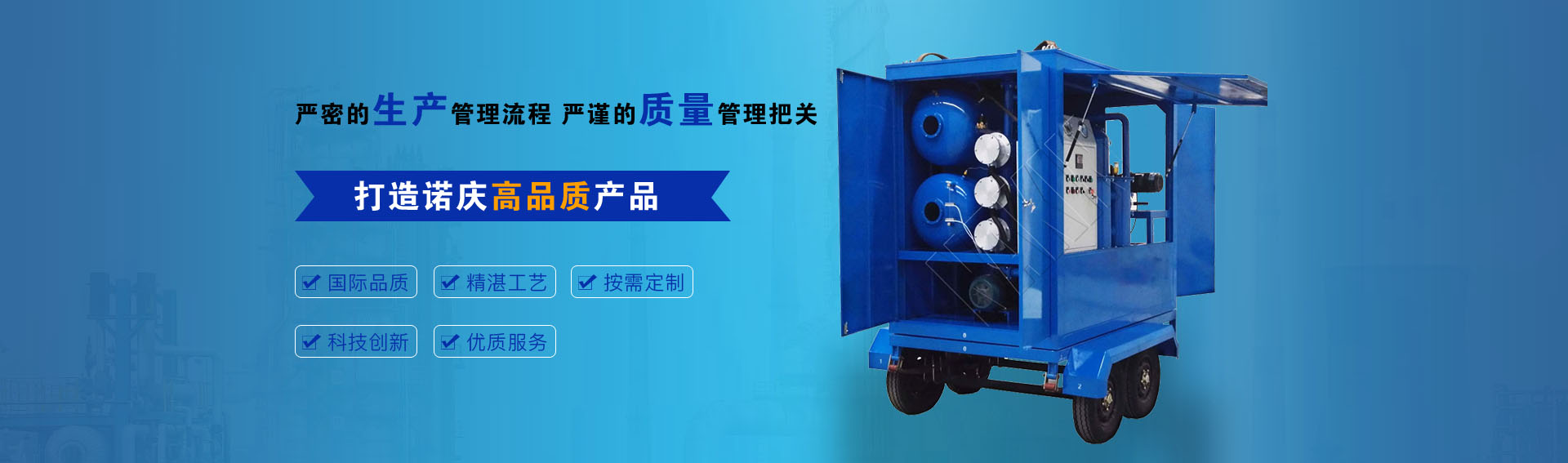 公司通過(guò)ISO9001-2015質(zhì)量管理體系認(rèn)證,CE歐盟認(rèn)證,諾慶公司所有濾油機(jī)配套產(chǎn)品均采用國(guó)內(nèi)外知名品牌,經(jīng)過(guò)多年的使用,具有質(zhì)量可靠,性能優(yōu)良。公司擁有完備的檢測(cè)儀器和檢測(cè)設(shè)備,所有產(chǎn)品出廠前經(jīng)過(guò)嚴(yán)格測(cè)試,保證每一臺(tái)產(chǎn)品合格出廠。